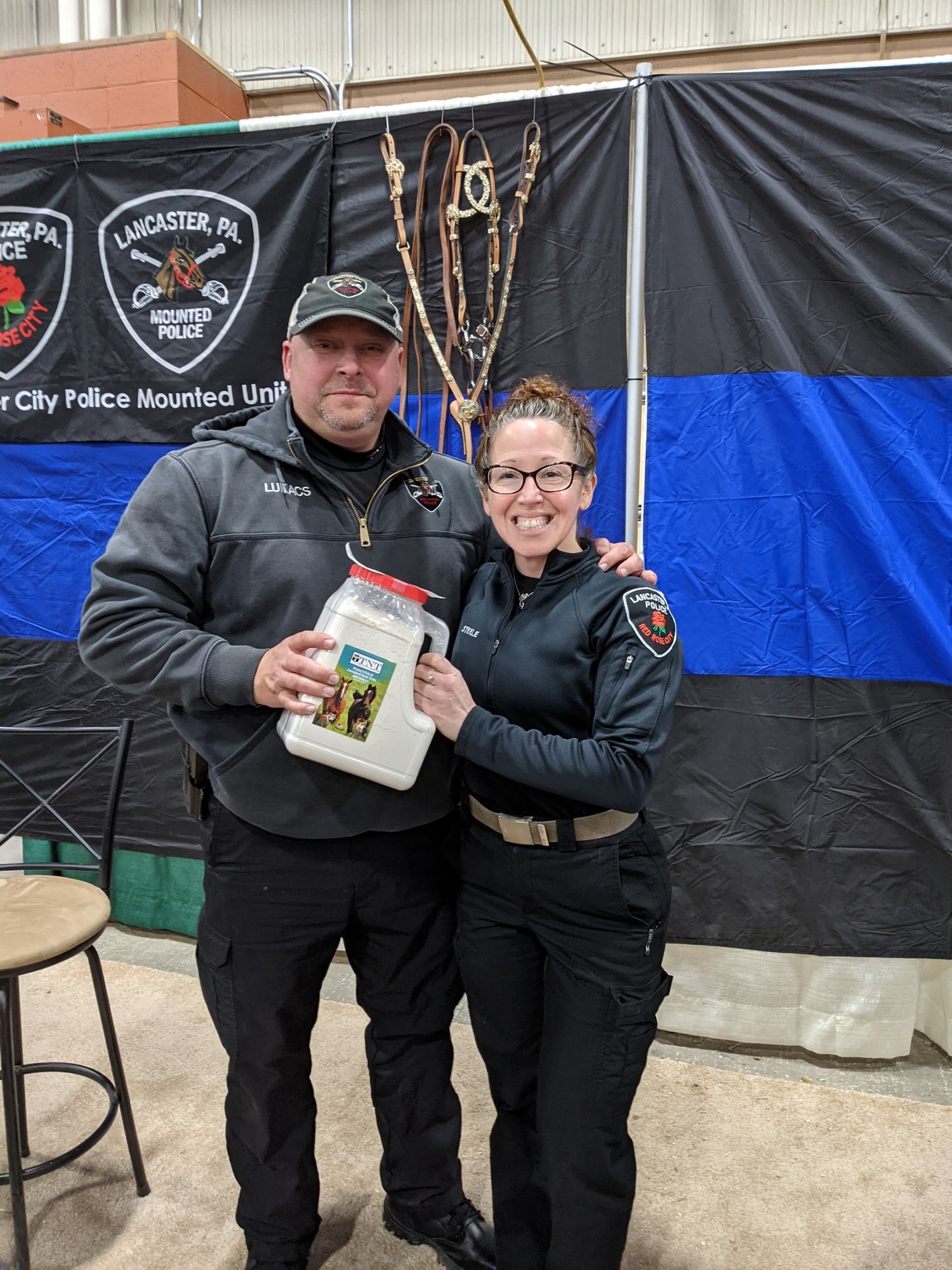 Picture: Two Lancaster City Mounted Police Officers posing with an Extra Large Jug of TNT at the HorseExpo in Harrisburg, PA